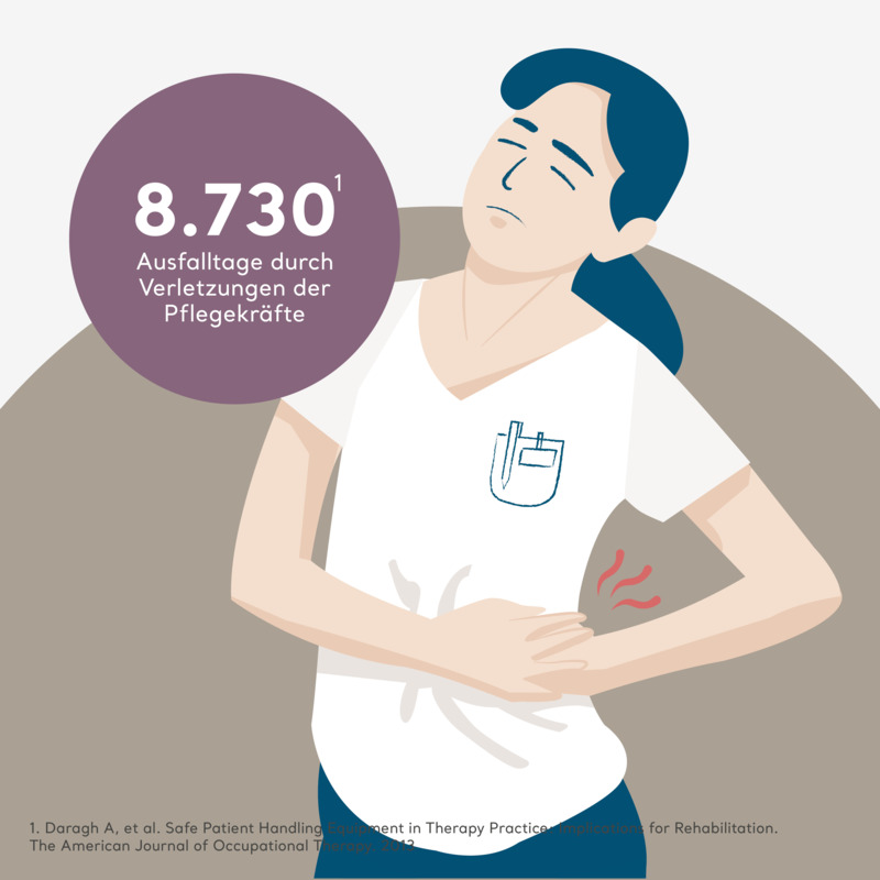 Ohne angemessene Unterstützung sind Pflegekräfte anfällig für Erkrankungen des Bewegungsapparats, die eine häufige Ursache für Fehlzeiten am Arbeitsplatz im Gesundheitswesen sind.⁵ Tatsächlich resultieren 59 % der Verletzungen des Bewegungsapparats bei Pflegekräften aus der Umlagerung oder dem Transfer von Pflegebedürftigen sowie aus der Vermeidung von Stürzen.⁶ ​