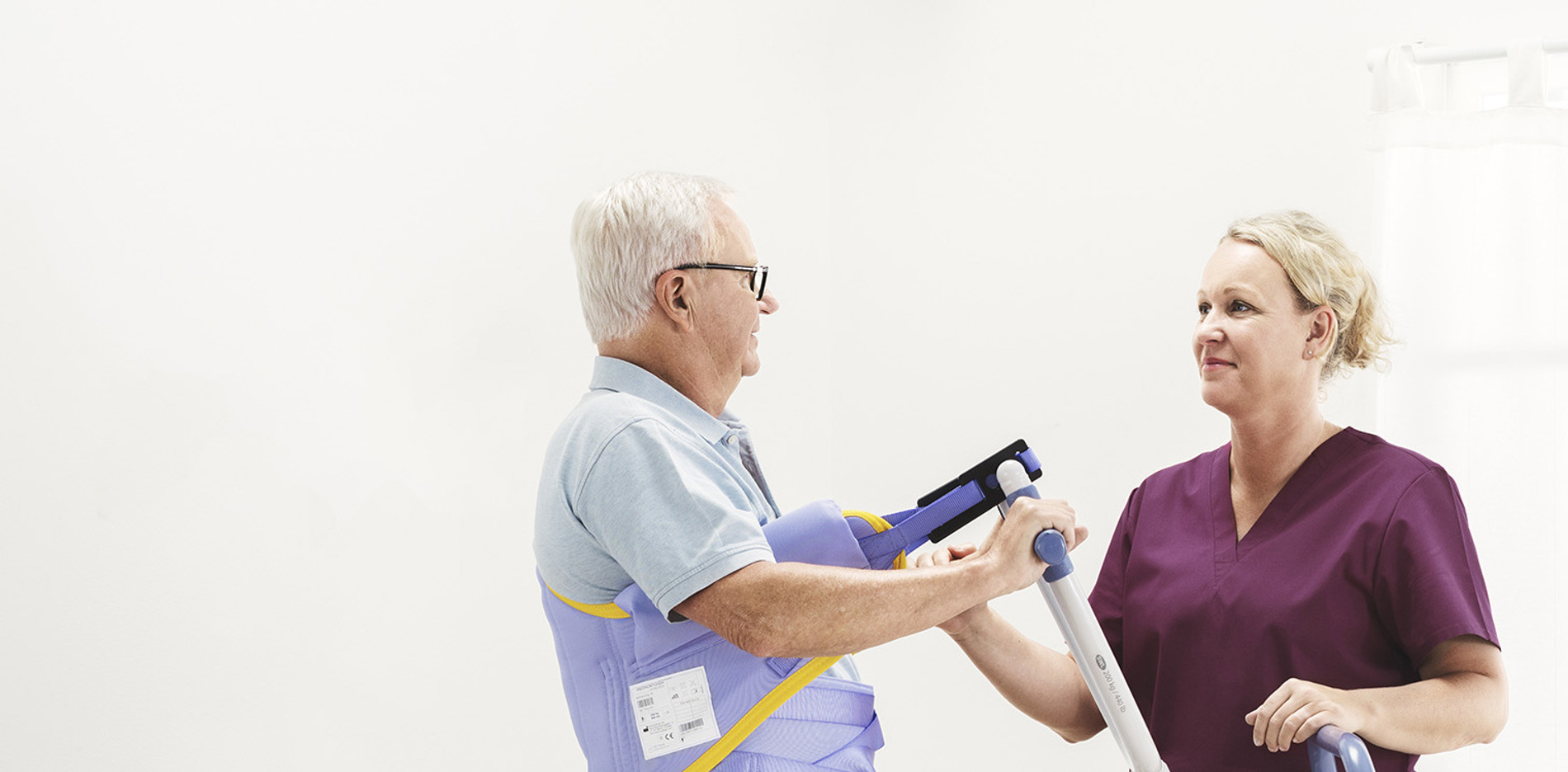 座位姿勢からの立位姿勢への電動式位置決め 立位姿勢での移乗を可能にする 座位姿勢から立位姿勢への非電動式位置決め 立位姿勢での移乗を可能にする Arjoの立位補助具と起立補助具に対応するスリングの選択 起立機器が患者様を活性化するのを助け、上半身を支えながら端座位から直立状態の立位へと移動します。
